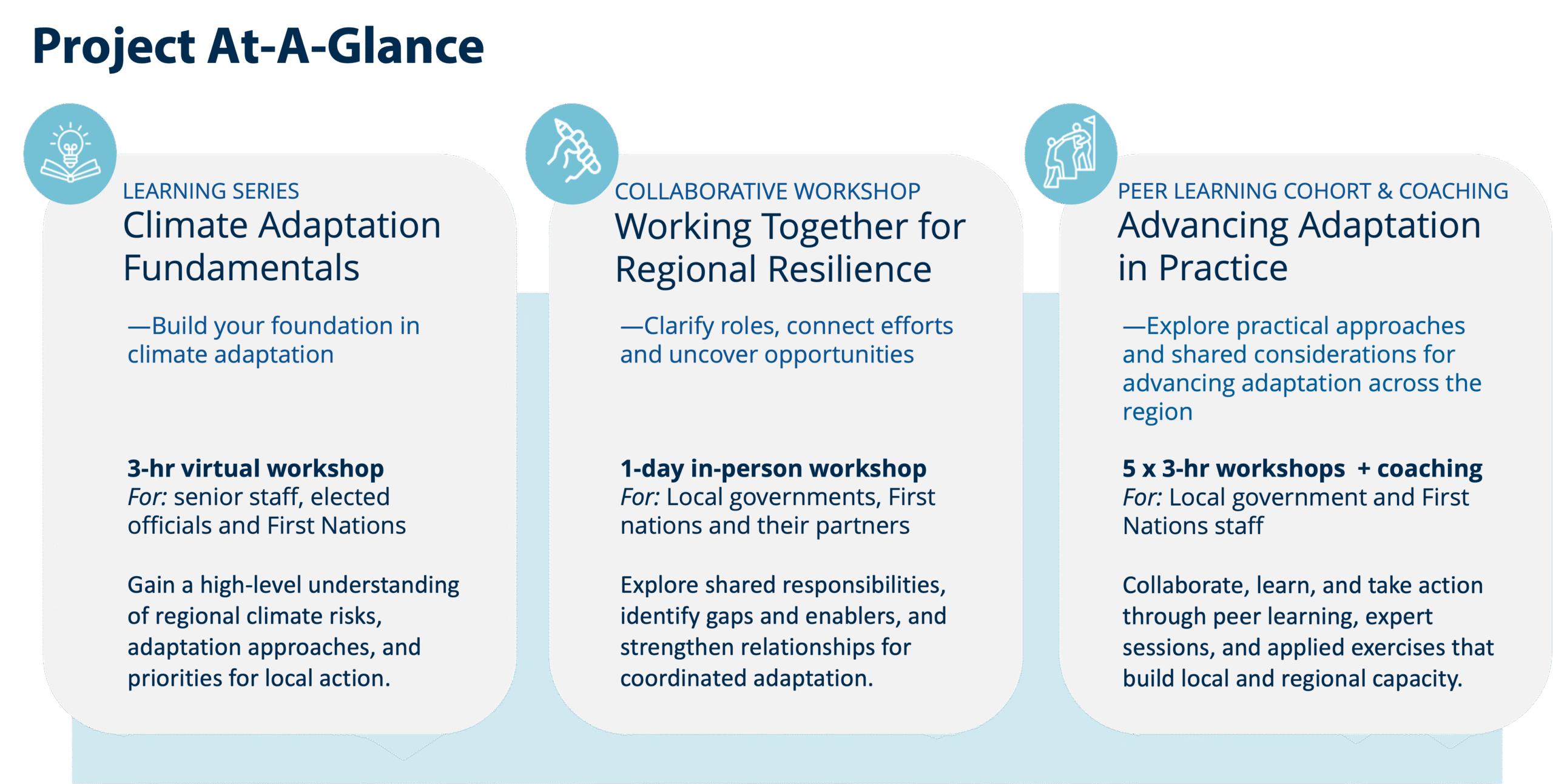 The Capital Regional District (CRD), with support from SHIFT Collaborative and Pinna Sustainability, is launching a new capacity-building program to support local governments, First Nations, and regional partners in advancing climate adaptation and resilience. This program is designed to build foundational knowledge, foster collaboration, and strengthen applied skills through three distinct learning and collaboration opportunities. Each offering is tailored to meet participants where they are in their adaptation journey—whether just beginning or actively leading change.